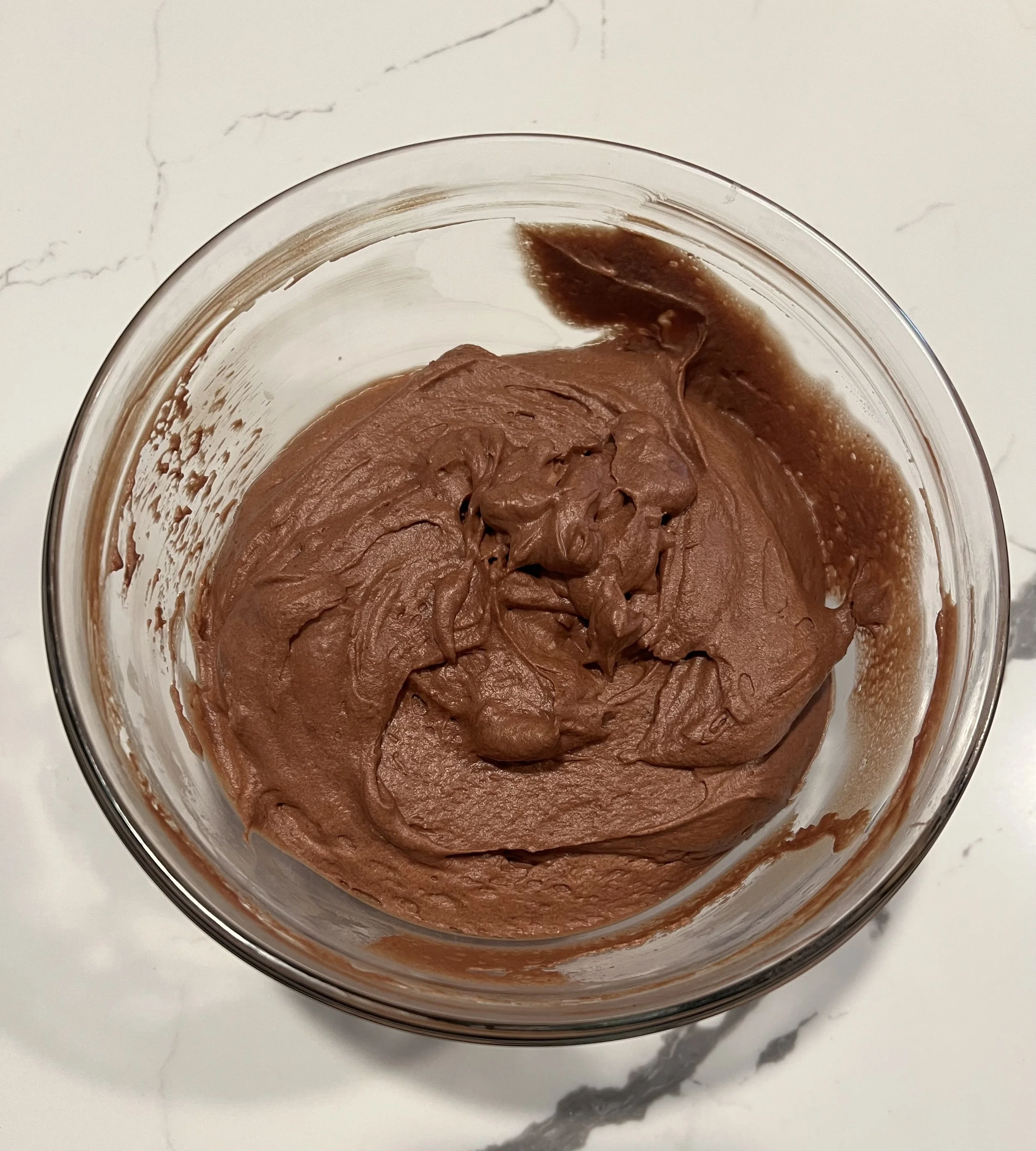 Scoop out egg white peaks and fold slowly into chocolate batter. I use a spatula and fold until uniform in color.